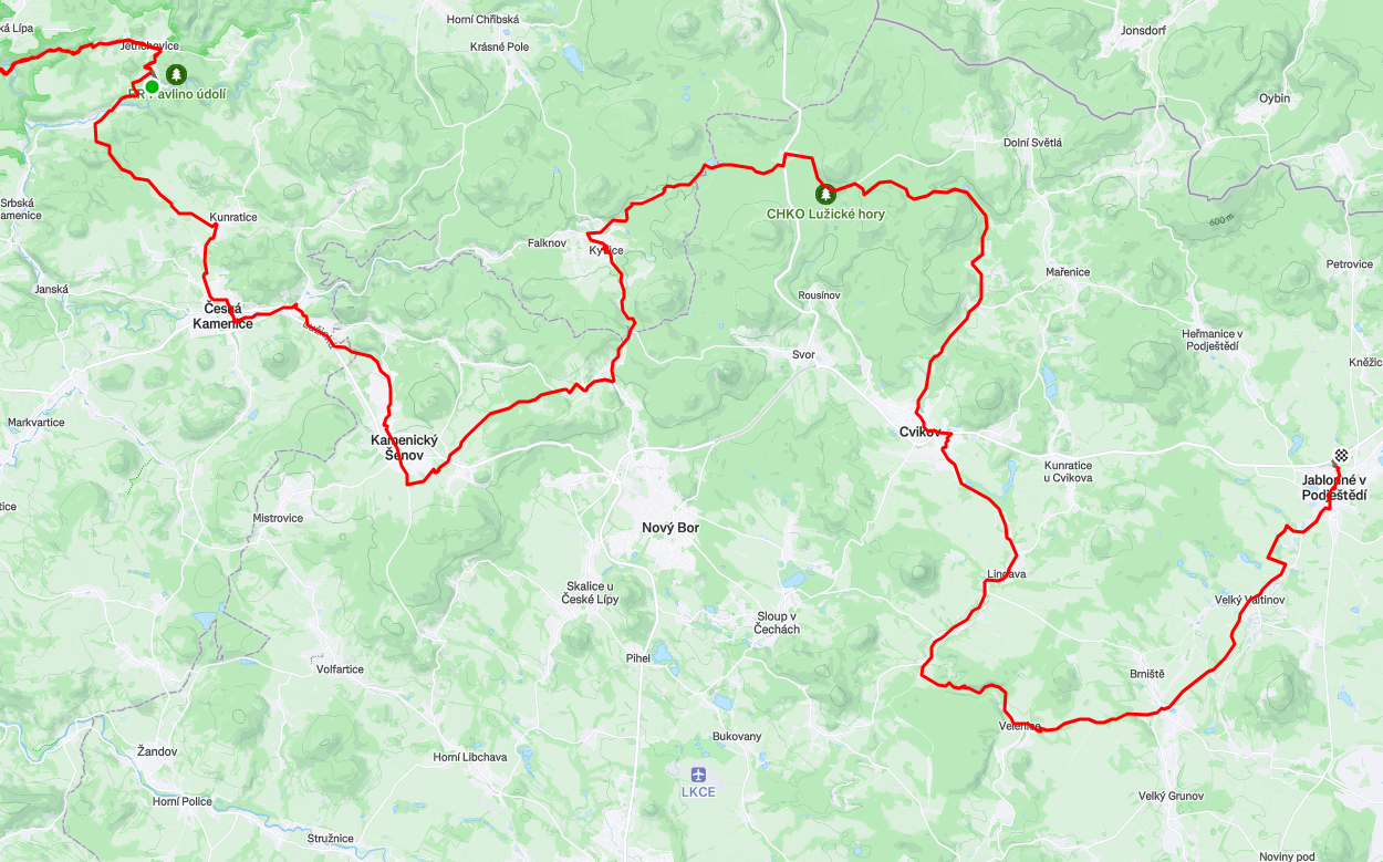 No a pak už to konečně bylo z kopca, díky bohu na nebesích (a mapě.cz). Zbývalo nějakých 13 kiláků do cíle v Jablonném v Podještědí, kde jsme se nasáčkovali do autokempu u hlavní cesty – což člověk pochopí až ve dvě ráno, když ti kolem stanu projede kamion a málem ti sfoukne spacák z prdele.