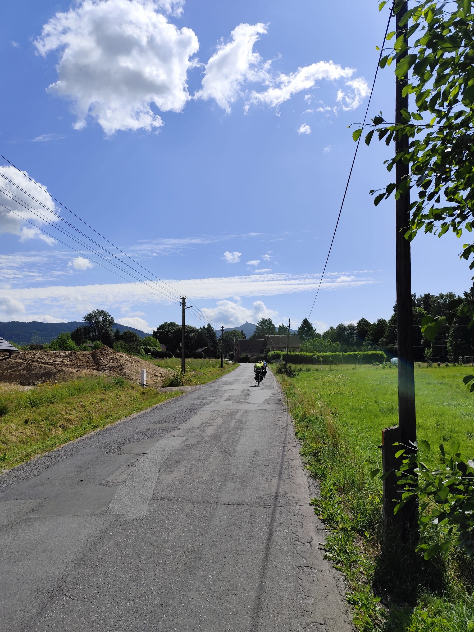 Dolů jsme frčeli jak střelení – Martin na e-biku přišel o brzdy, což není ideální, když jedeš na kole, co váží jak malá Honda Goldwing. Ale přežil, takže dobrý. Pak následovala etapa přes polňačky, sice "z kopca", ale reálně do hajzlu – protože to šlo mírně furt nahoru.