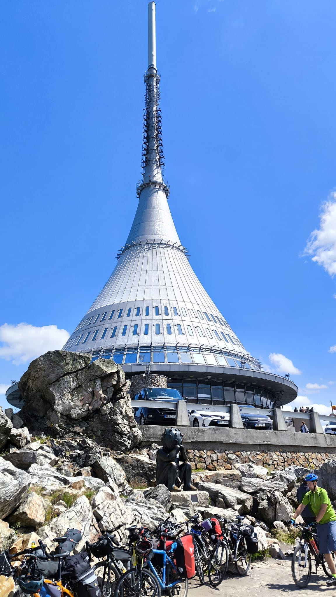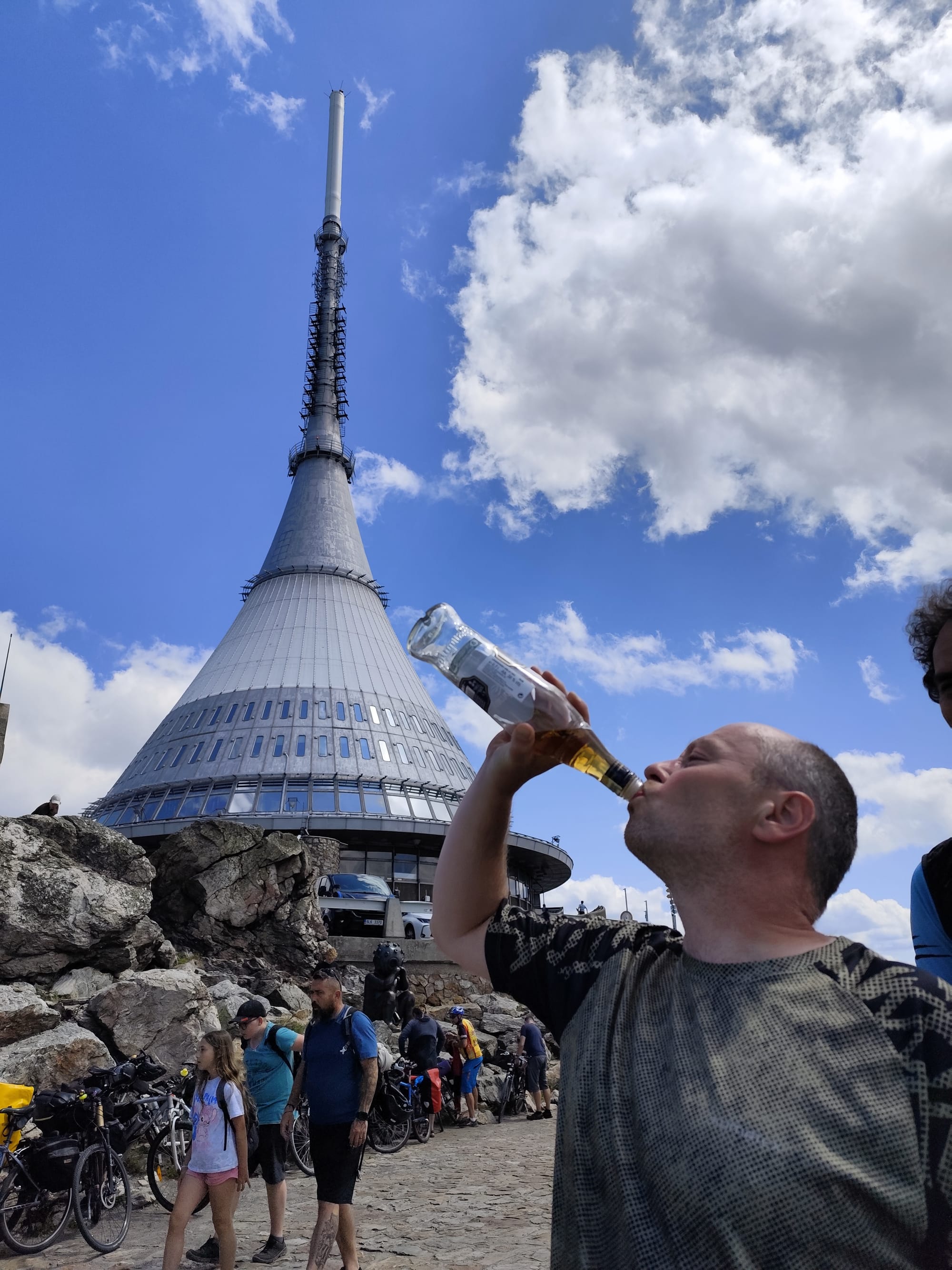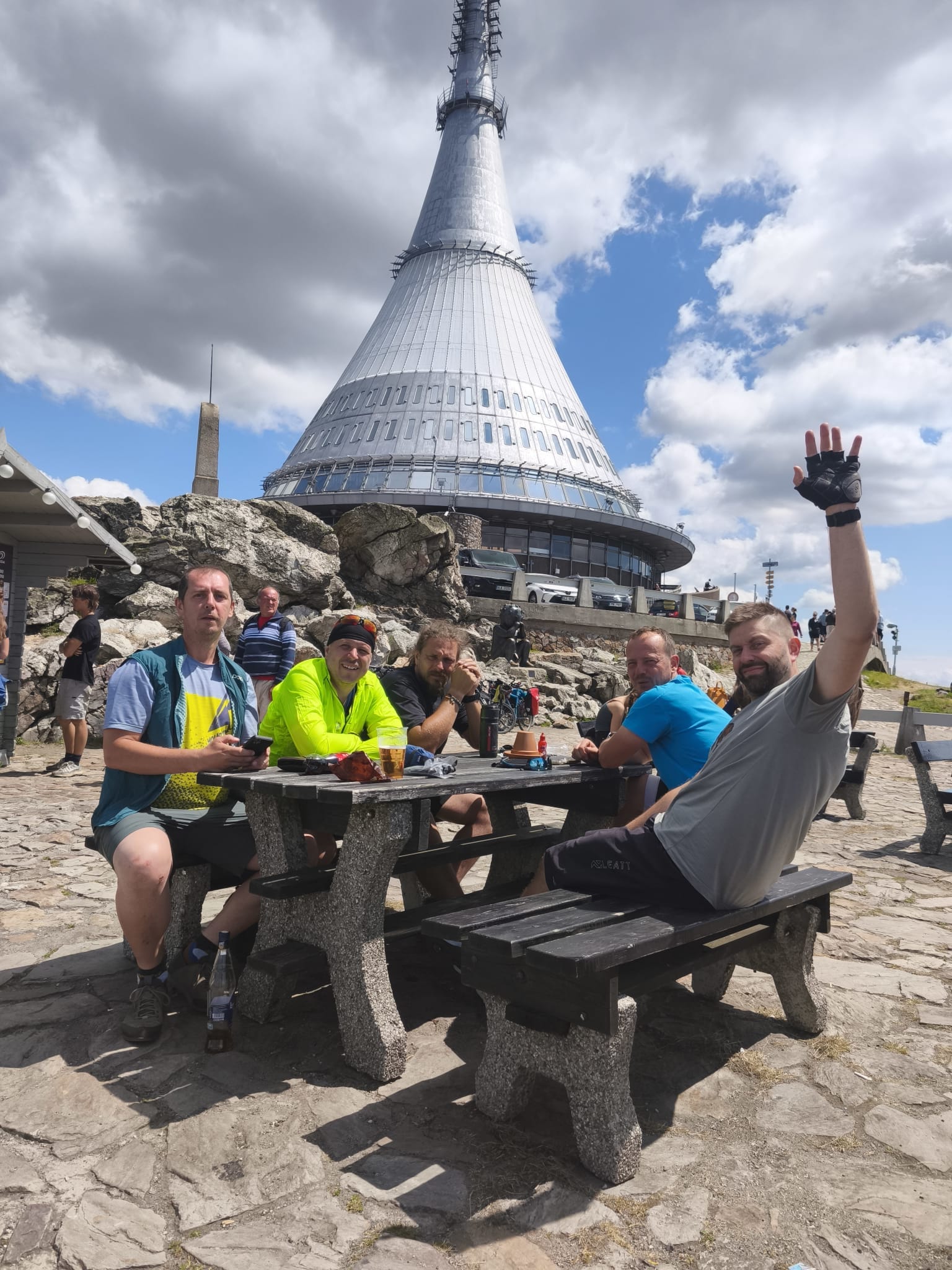 Jenomže to mělo háček – žrádlem přežraní jak prasata, a před náma největší krpál Dorotky – výšlap na Ještěd. Kdo to vymyslel, měl by dostat přes pysky. Ale jak zpívá Helenka – „vzhůru k výškám“, tak jsme ty pojebaný kola osedlali a vyrazili.