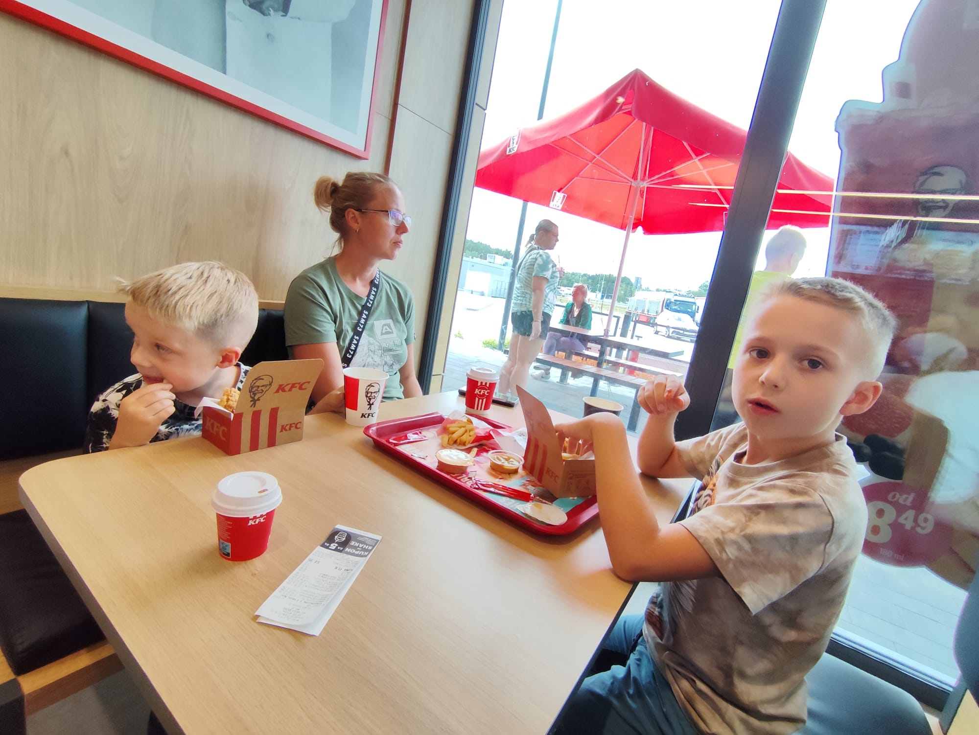 Cesta ubíhala svižně – kdyby teda první dvě hodiny nelilo jak z konve, bylo by to na pohodu. První „čurací zastávka“ padla po 330 km, čemuž jsem se sám divil, že to kluci tak dlouho vydrželi. Další pauza přišla za dalších 35 km, když nás nalákalo KFC na benzince. Kuře na sto způsobů, nafta za nekřesťanské peníze – klasika. Naštěstí další dvě zastávky už byly jen „nutného rázu“ a lehké ujídání čerstvě napečených koláčů.