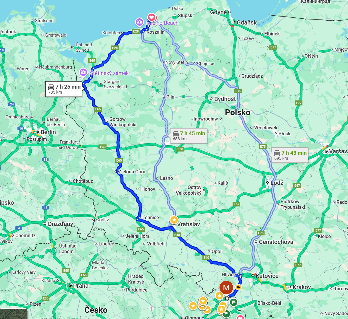 Počasí nám hned na úvod ukázalo, že „dovolenkové počasí“ ne vždy znamená slunce – proudy vody z nebe nám pěkně vymáchaly náladu, ale říkali jsme si, že horší už to být nemůže. Google nás poslal západní cestou – jednak byla nejkratší, a taky jsme si řekli, že když jsme loni jeli tou východní, tak letos to chce změnu. A vyplatilo se! Tým 2 (babi, děda, teta Pája, strejda Dan, Fanda a Rozárka) si to vzal východem směr městečko Ustka, takže bude co porovnávat.